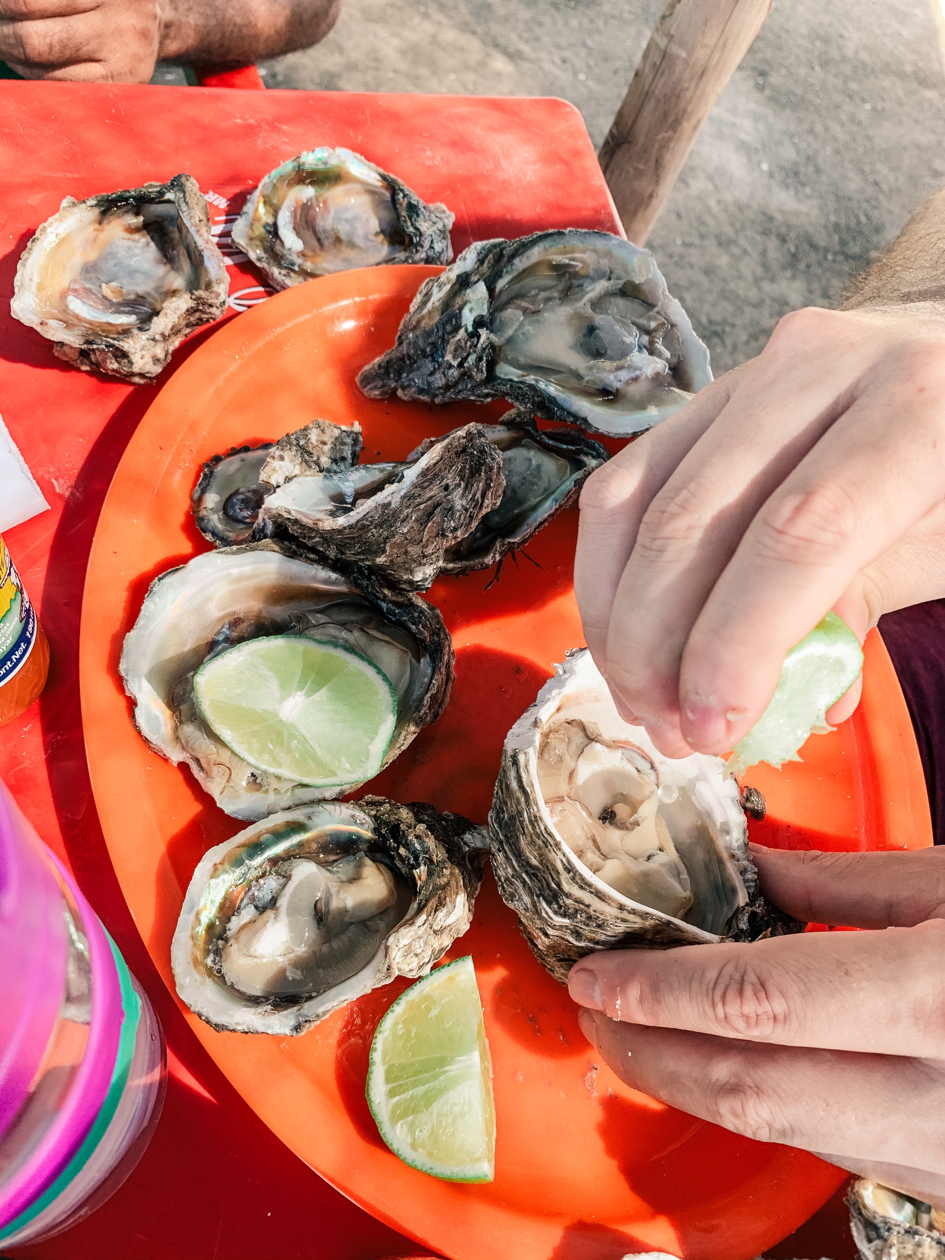 A short drive towards the coast, you will find yourself dinning off a cliff overlooking the ocean to the west and the mountains looking east, all while enjoying freshly made aguachile (shrimp salad with cucumber and red onion in a green Chile sauce) and some recently caught and shucked oysters.
