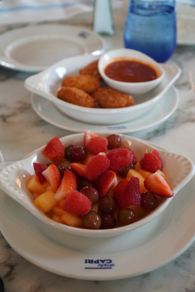 The kids menu comes at a cost of $15 with a soft drink included for the party members 10 years or younger. They get a choice of appetizer entree and they finalize their meal with some delicious gelato. Our kids are fruit lovers and were excited when they saw that was an appetizer option and you can never go wrong with the other option of mozzarella. As for entrees the spaghetti and meatballs was the choice of all 3 of our kiddos.